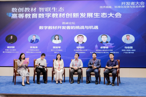 我校机电工程学院余攀峰副教授受邀出席大会,并作为高职院校代表之一,参与以“数字教材开发者的挑战与机遇”为主题的圆桌论坛,与浙江大学出版社副社长黄娟琴、人民邮电出版社教育出版中心总经理李海涛、机械工业出版社数字资源创作中心主任谢欣新、北京航空航天大学教务部副部长杨明轩和阿里云智能大模型产品方案专家马俊国共同交流数字教材在实际开发与教学应用中的现实问题与发展趋势。
