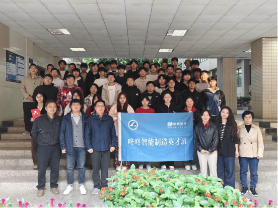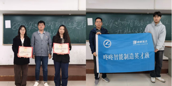 仪式上还举行了企业聘书与班旗授予仪式。武汉咚咚英才教育科技有限公司苟超越经理为辅导员颁发聘书,武汉华工正源光子技术有限公司赵志勇副总监为订单班授班旗,标志着校企双方共建的“咚咚智能制造英才班”正式启航。