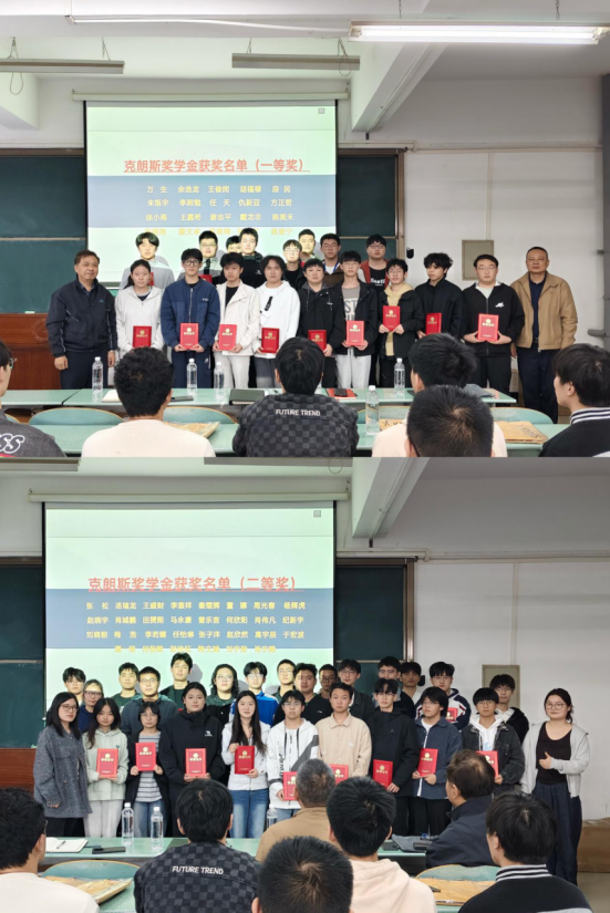 随后,洪凯院长宣读了《关于授予余浩龙等同学克朗斯奖学金的决定》,通过民主综合考核评价,决定对50名同学授予2023、2024年度“克朗斯奖学金”。其中一等奖20名,二等奖30名。学院领导与企业嘉宾为获奖学生颁发了荣誉证书,并合影留念。