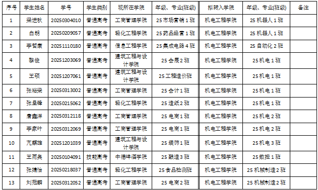 经学生个人申请,我院按照《湖北轻工职业技术学院学生转专业管理办法(试行)》相关规定,对所有申请学生进行初步审核及测试,结合我院转入专业净人数情况,现将拟同意转入机电工程学院2025级学生信息公示如下: