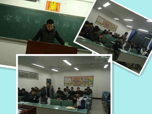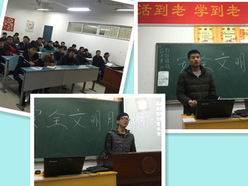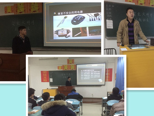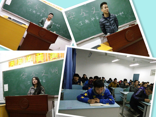 2015年12月6日19:00,机电工程学院15级各个班级在A栋四楼进行了“寝室安全文明”的主题班会,班会分为三部分。第一部分,由主讲人向同学们介绍什么是安全隐患、大功率电器和有关文明的事项。第二部分,向大家讲解因为不安全用电引发的一系列事例,以此来警示同学们一定要安全用电,除了安全用电,还讲到了防火和防盗的相关问题。第三部分,由班干部向大家介绍如何安全用电,以及同学们对生活中的一些问题进行提问。