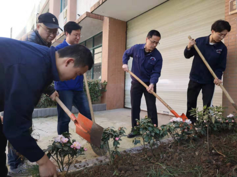 植树现场,师生热情高涨,抡锄挖坑,手扶树苗,挥锹培土,提桶浇水,一道道工序细致认真,有条不紊。经过近一个小时的忙碌劳动,一片新栽的四季桂树苗迎风挺立,为三月的校园增添了一抹盎然的绿意,也让机电实训中心楼下的花坛生机勃勃。