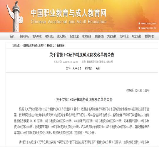 “1+X”证书制度是2019年初《国家职业教育改革实施方案》提出的职业教育四项重要改革项目之一。“1+X”证书是以社会需求、企业岗位(群)需求和职业技能等级标准为依据,对学习者职业技能进行综合评价,可如实反映学习者职业技术能力。此次入围的试点院校在面向本校学生开展培训的同时,也可以为社会成员提供培训服务。