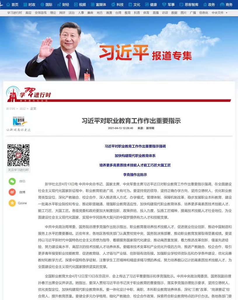 转发新华网---习近平对职业教育工作作出的重要指示