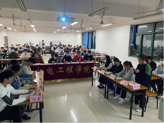【机电工程学院党章记者团程浩讯 指导老师:刘畅】2021年4月8日晚上七点,由机电学院团总支学生会秘宣部主办,文艺部协办的辩论赛决赛在B403隆重举行。出席比赛的嘉宾有机电工程学院辅导员兼学生支部青年委员刘畅老师、20电气自动化班和机器人班的班主任张鹏老师和实习老师周治燕。担任此次评委的是辅导员兼学生支部青年委员刘畅老师、周治燕老师、机电学院学生会主席贾恒鑫同学、团总支学生会书记刘玉成同学和党章记者团团长程浩同学。