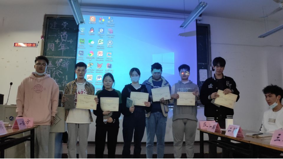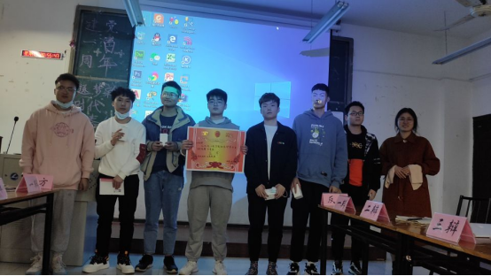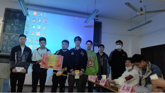 图四:团总支学生会主席贾恒鑫、党章记者团团长程浩为优秀团体奖20机电一班颁奖