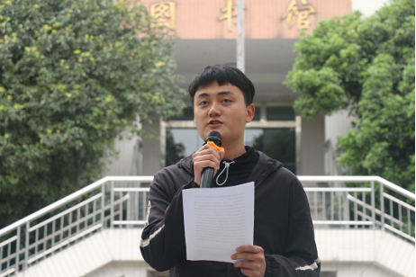 图四 学生代表机电工程学院团总支书记刘玉成在国旗下演讲