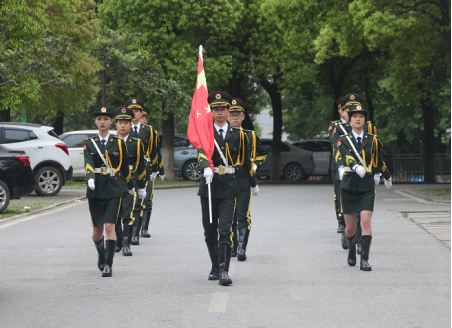 主持人宣布升旗仪式正式开始,英姿飒爽的国旗护卫队队员们护送鲜艳的五星红旗进场,伴随着庄严的《中华人民共和国国歌》旋律,五星红旗冉冉升起,迎风飘扬。全体师生行注目礼,满怀对祖国无限的热爱和崇高的敬意。