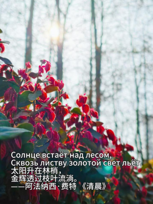 活动中,同学们漫步校园,用镜头捕捉春日里初绽的繁花、鲜嫩的春草,记录浸润着清润雨意的教学楼、校园连廊等标志性建筑景致,将校园里的春日美好一一定格成帧。在指导老师的带领下,同学们为拍摄的作品精心融入叶赛宁、阿法纳西・费特等俄罗斯文学名家的经典诗句,融汇中俄双语主题寄语,让一张张定格校园春光的照片,兼具自然美感、俄语文化韵味与同学们的青春诗意。