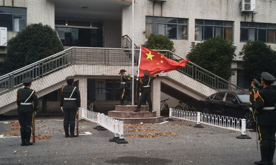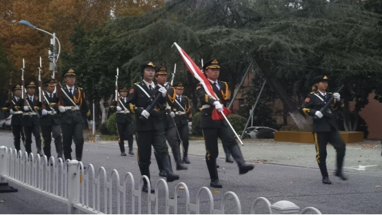 仪式伊始,身着整洁服装的国旗护卫队队员迈着铿锵有力的步伐,从篮球场左侧整齐列队而出。他们身姿挺拔、精神抖擞,每一步都坚定沉稳,伴随着清脆的口令,缓缓走向国旗台,现场所有人目光庄重,静静注视着这一神圣时刻。