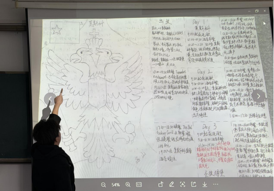 活动中,81名学子化身“旅行策划师”,在语言老师黄汝玉和专职辅导老师张倩的指导下,以小组形式完成了跨国旅行蓝图的自主设计与展示。各小组从路线规划、预算控制、文化解读到美食探索,进行了全面调研与创意构思,最终通过精制的手绘地图与现场路演呈现成果。
