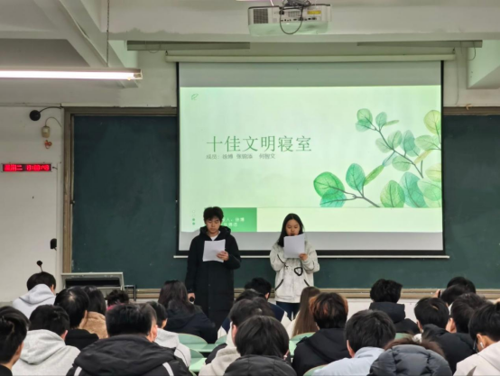 活动现场,各寝室代表通过PPT生动呈现宿舍环境布置、文化特色与成员相处点滴,从整洁雅致的居住空间到互帮互助的同窗情谊,从共同奋进的学习氛围到个性鲜明的青春表达,全方位展现了当代大学生积极向上的精神风貌。评委团依据展示内容进行综合评定,评选过程公平公正、井然有序。
